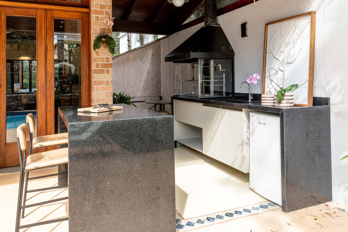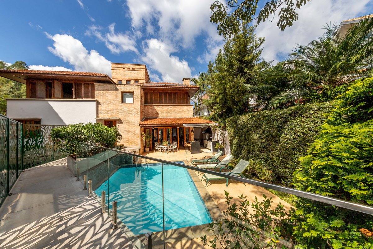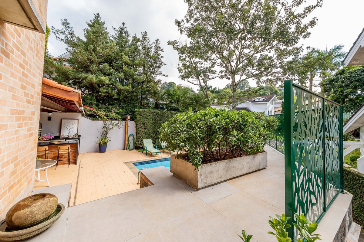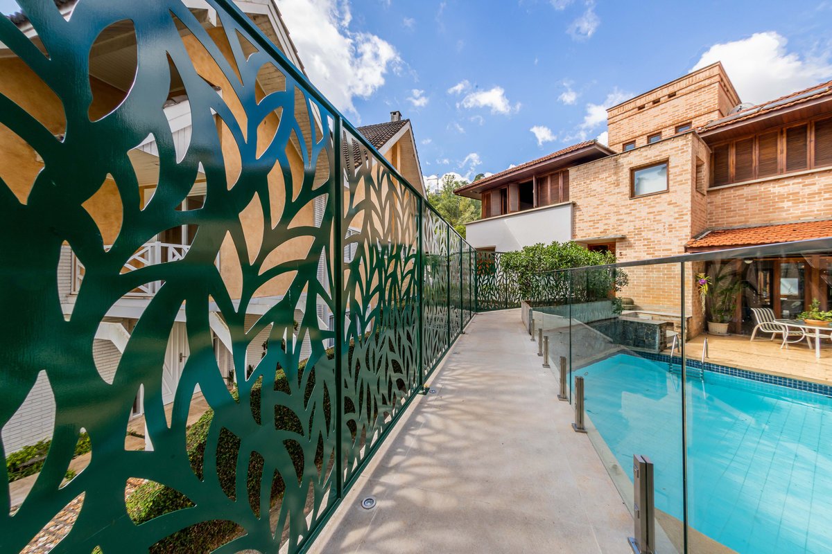 a casa e a piscina, trazendo para ela um painel em aço com estampa de folhagem.