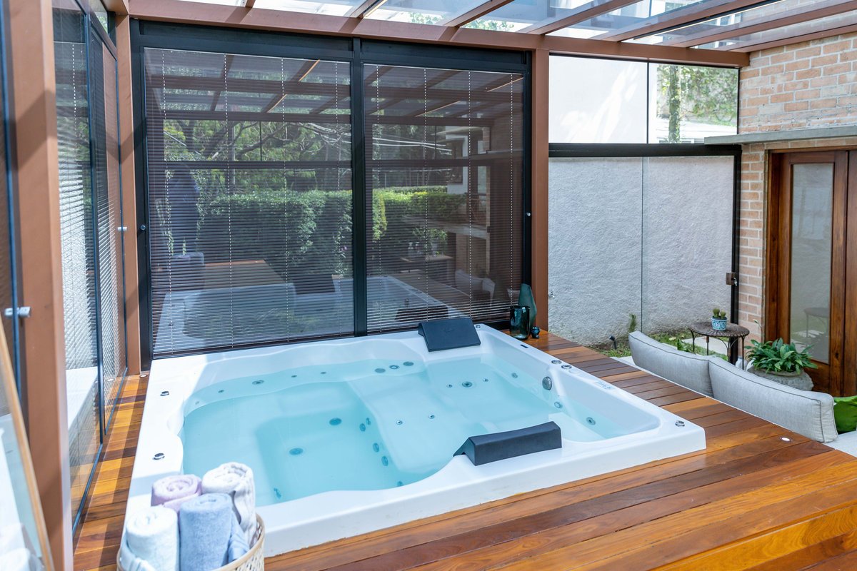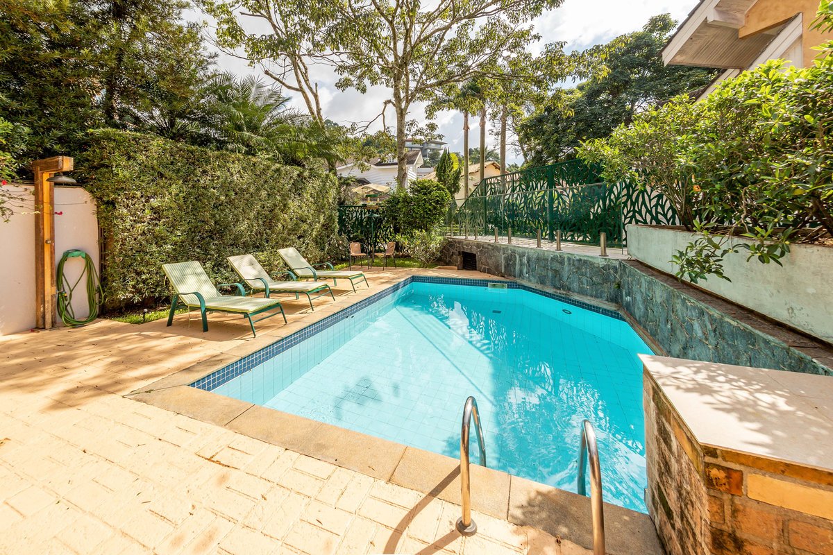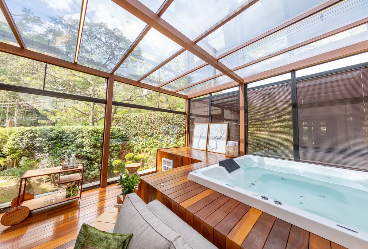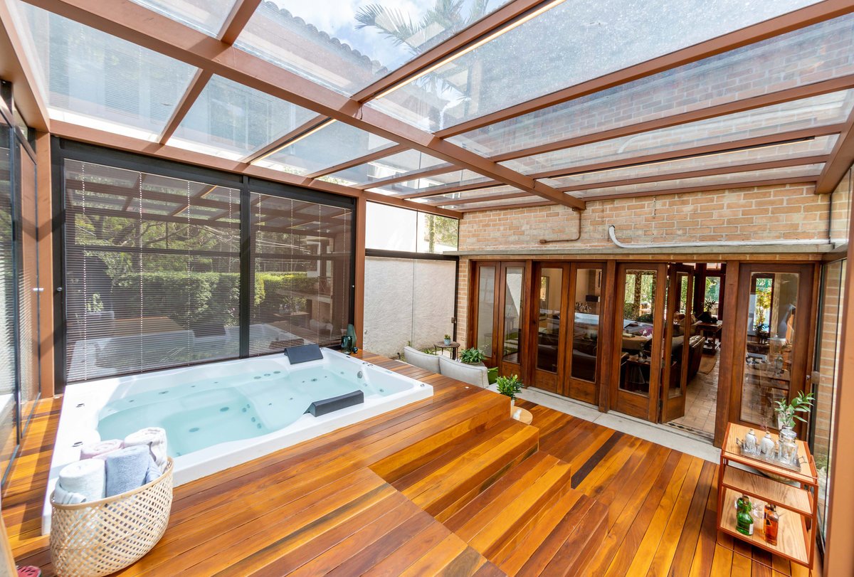 a casa e a piscina, trazendo para ela um painel em aço com estampa de folhagem.