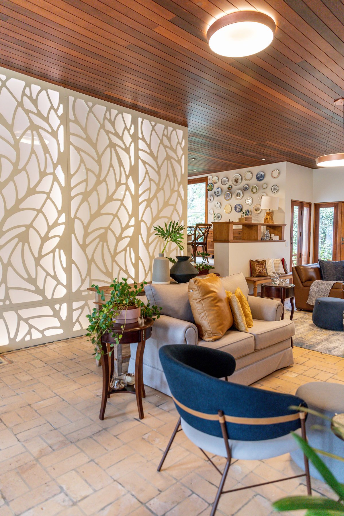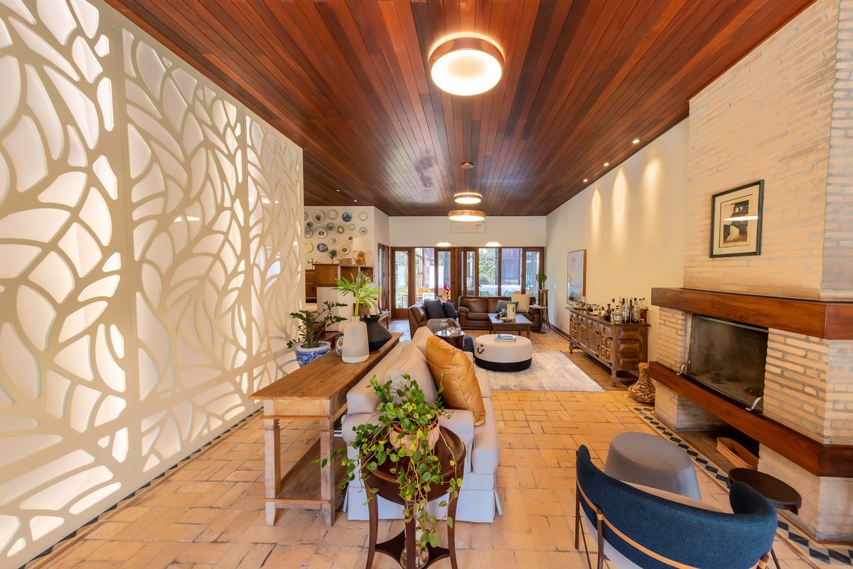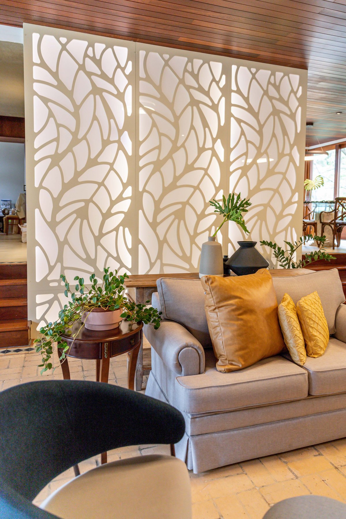 A estampa de folhagem nos acompanhou na sala, num grande painel iluminado, que contamos com a ajuda da Mentha Paineis, para executar, dessa forma, quebramos um pouco a repetição de tons entre madeira e tijolo, tão marcantes na sala.