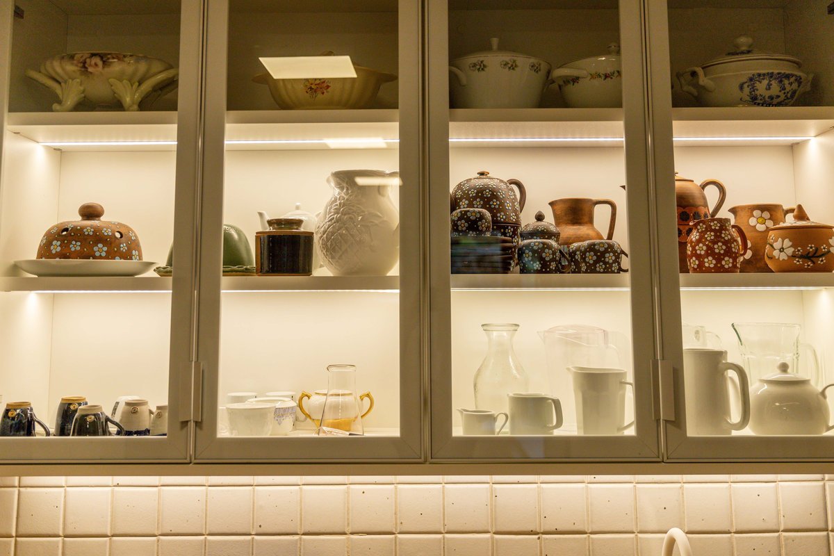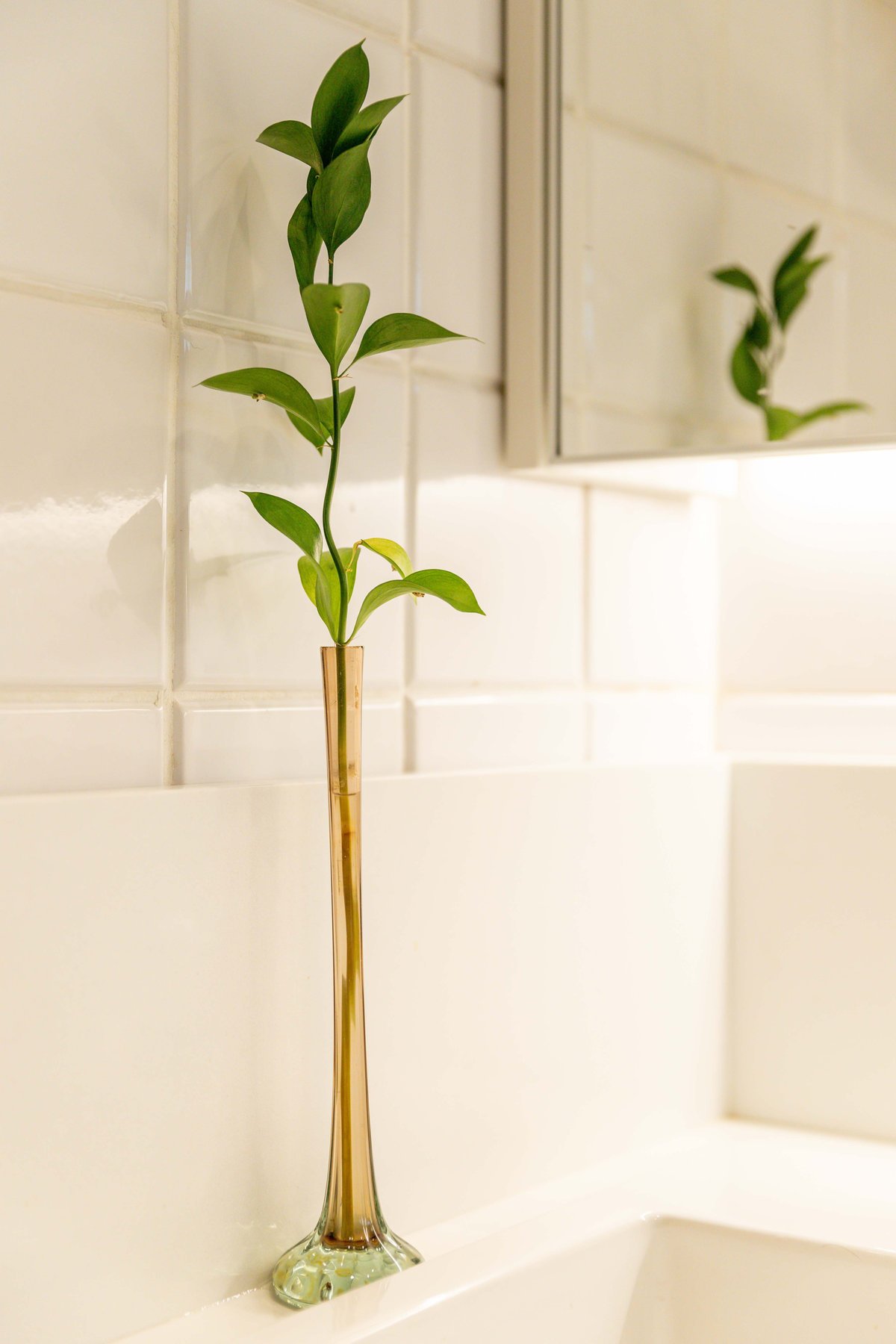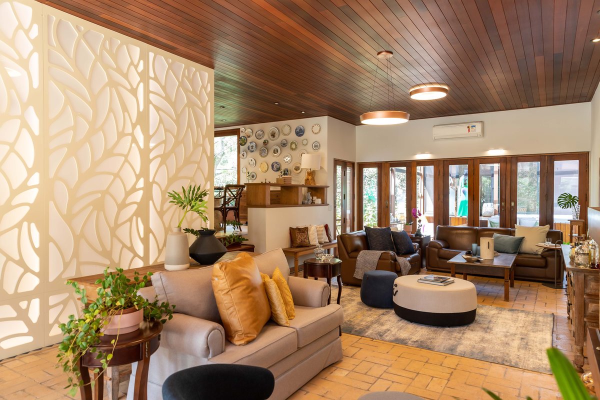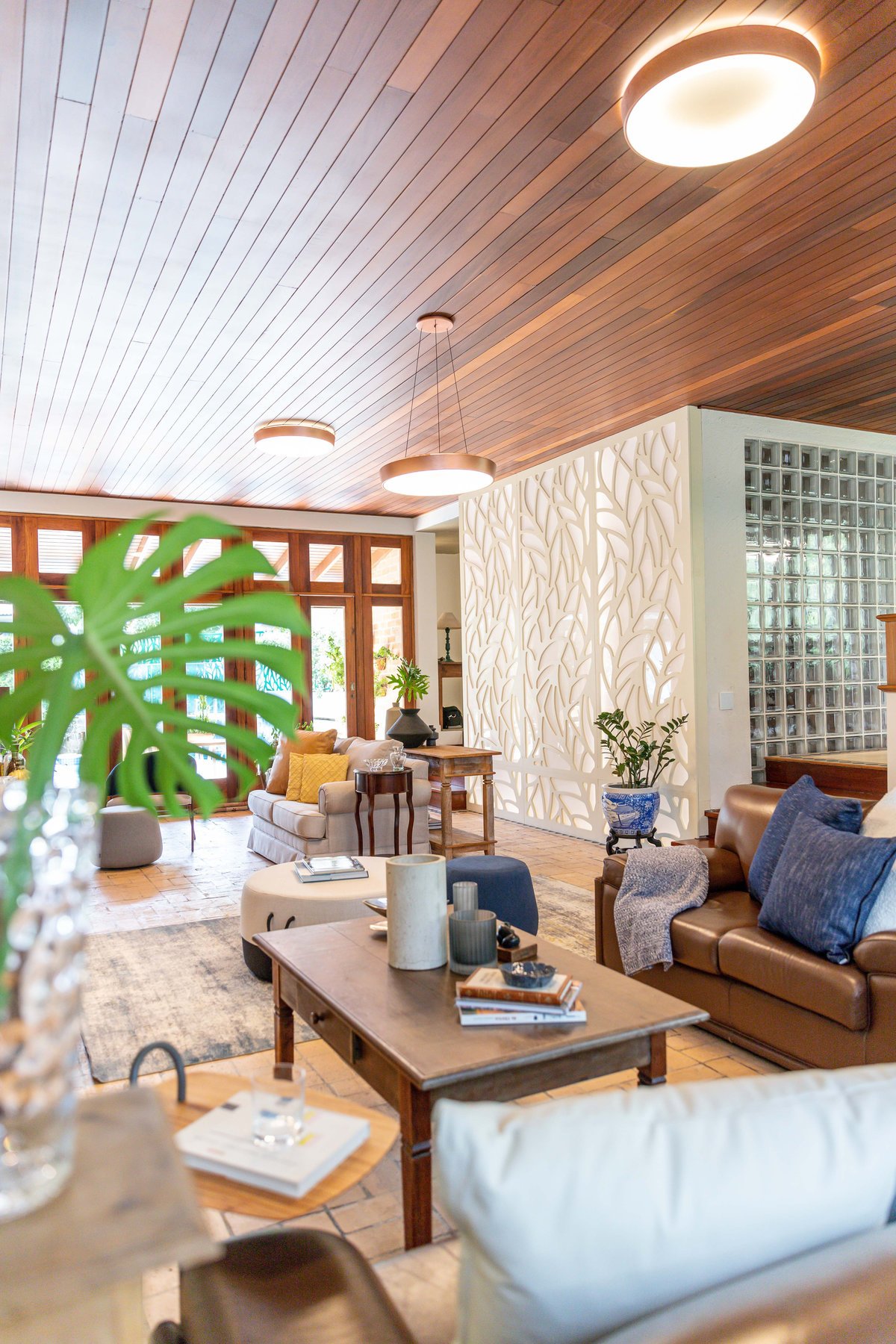A estampa de folhagem nos acompanhou na sala, num grande painel iluminado, que contamos com a ajuda da Mentha Paineis, para executar, dessa forma, quebramos um pouco a repetição de tons entre madeira e tijolo, tão marcantes na sala.